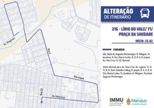Linha 216 Manaus terá o itinerário alterado a partir desta quarta-feira (25), conforme informou a Prefeitura de Manaus, por meio do Instituto Municipal de Mobilidade Urbana (IMMU). A mudança atinge o trajeto da linha de ônibus Lírio do Vale / T1 / Praça da Saudade e passa a valer imediatamente, com o objetivo de ampliar a cobertura do transporte coletivo e melhorar a eficiência operacional do serviço na zona Oeste da capital amazonense.